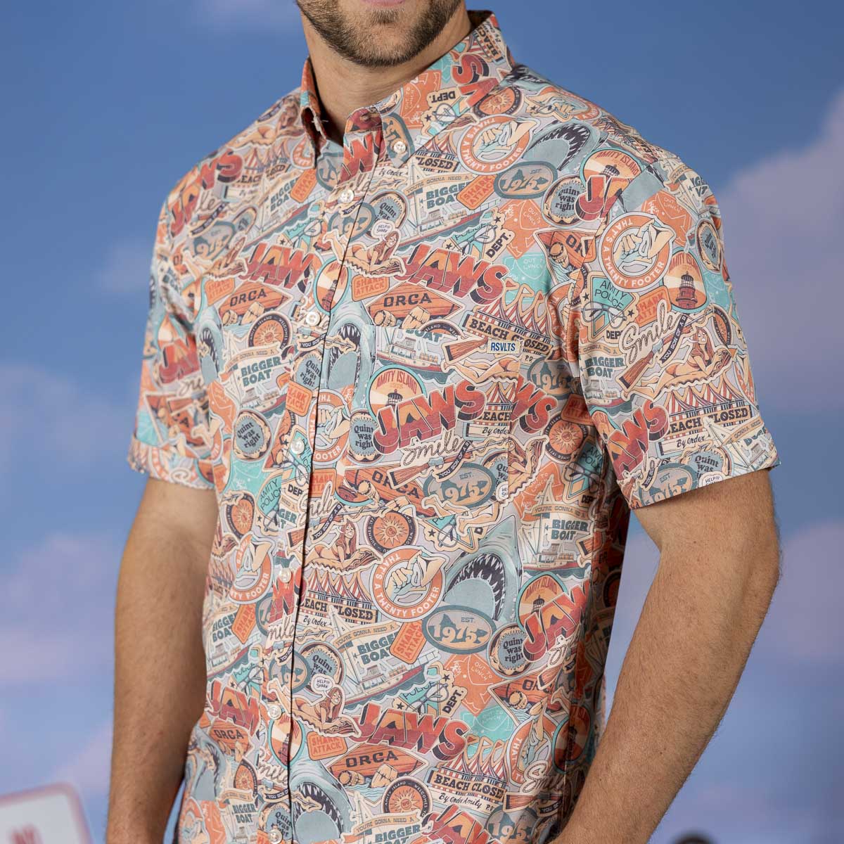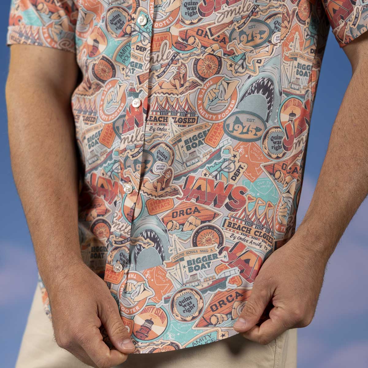 Whether you’re fishing for compliments or just a fan of lean, mean eating machines, this colorful collage of sticker-style Jaws imagery has you covered. Designed like a wearable scrapbook, it almost looks like the suitcase of a well-traveled individual who’s seen sun, sky, and one too many near-death experiences.