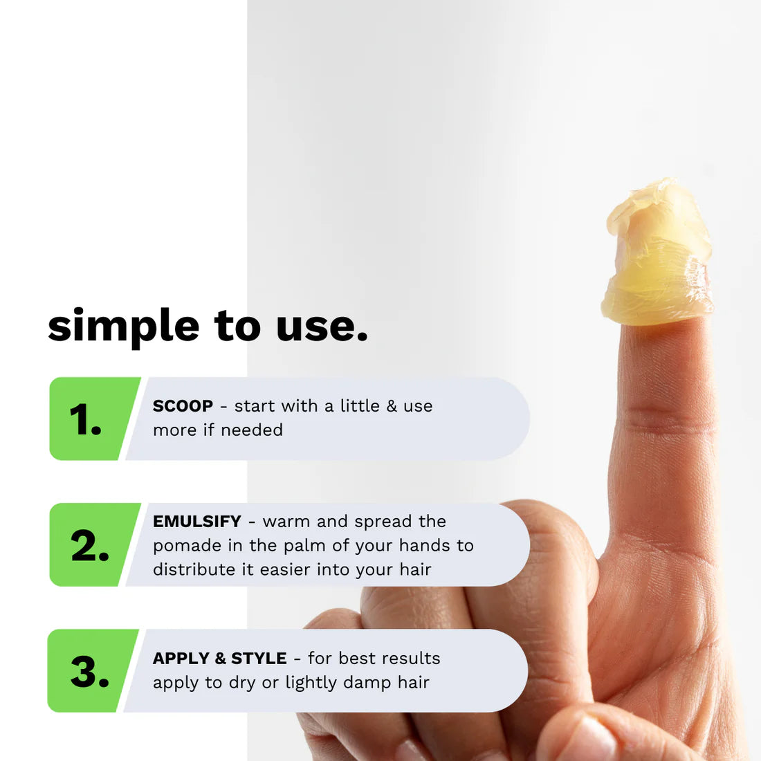 DIRECTIONS FOR USE: Rub a finger scoop into the palm of your hands and work until it softens, then apply to towel-dried hair, making sure to work into the roots. Style as desired. Run a wet comb through hair to re-activate the product.