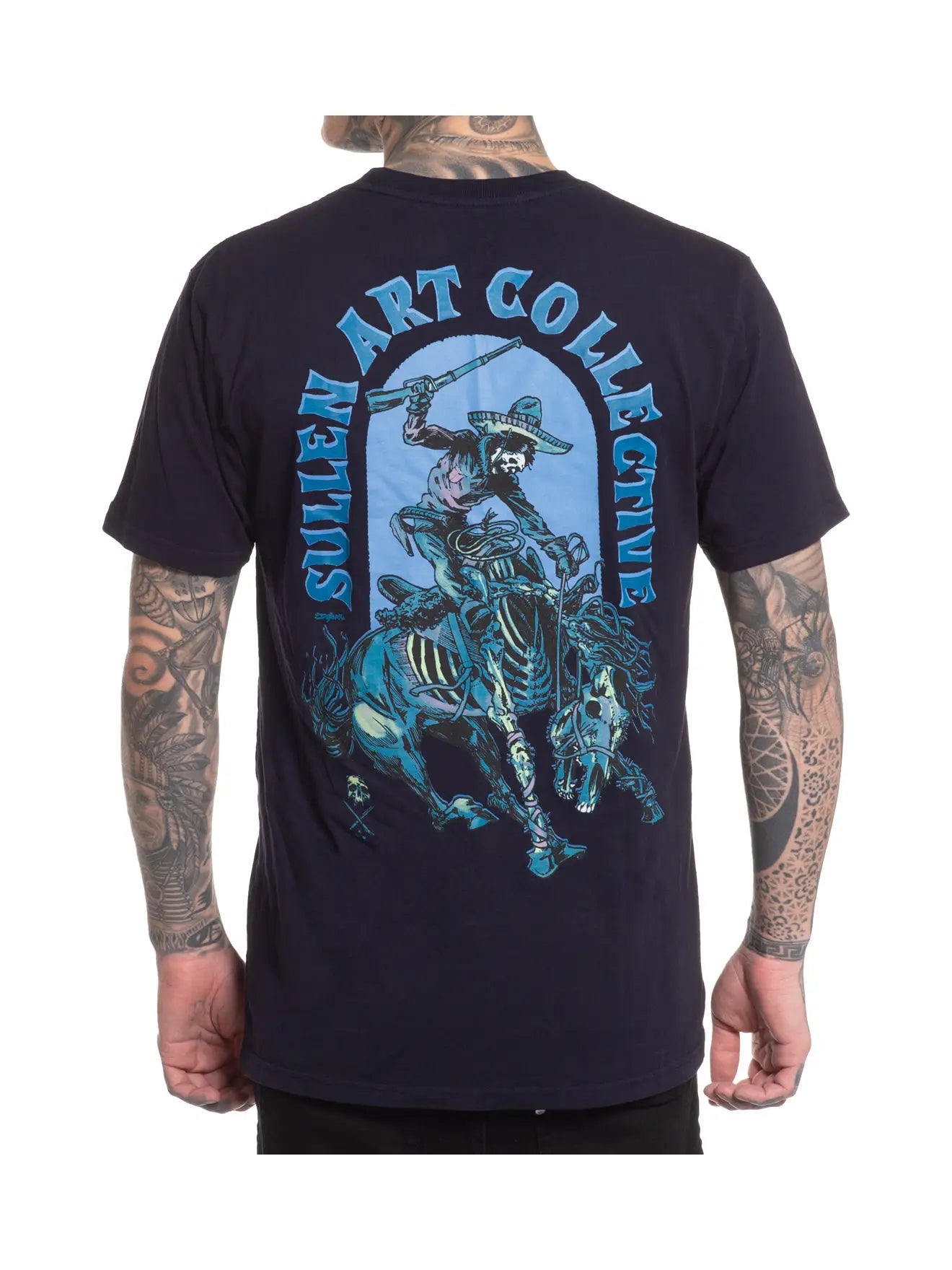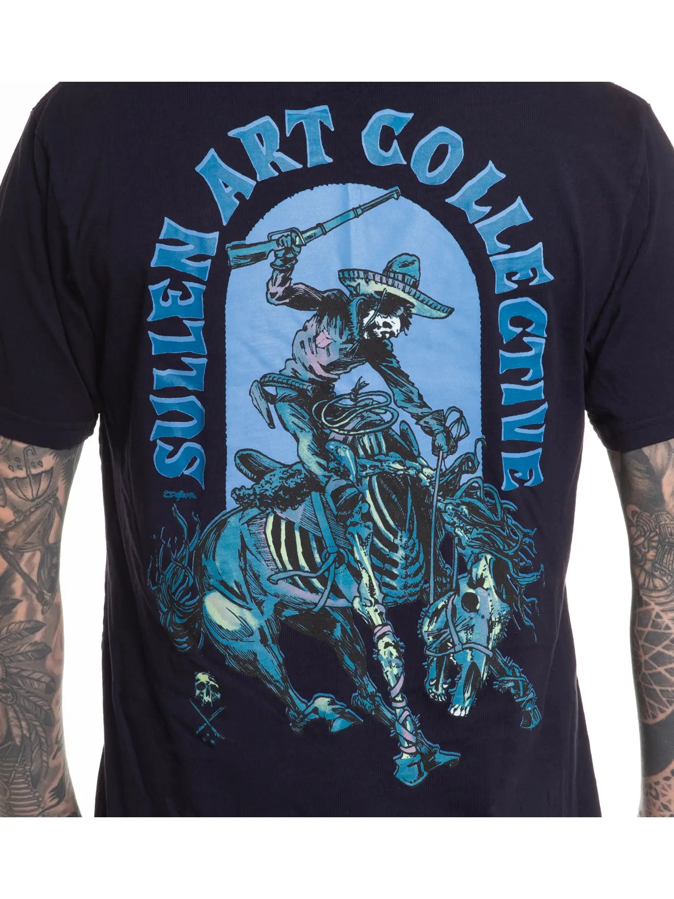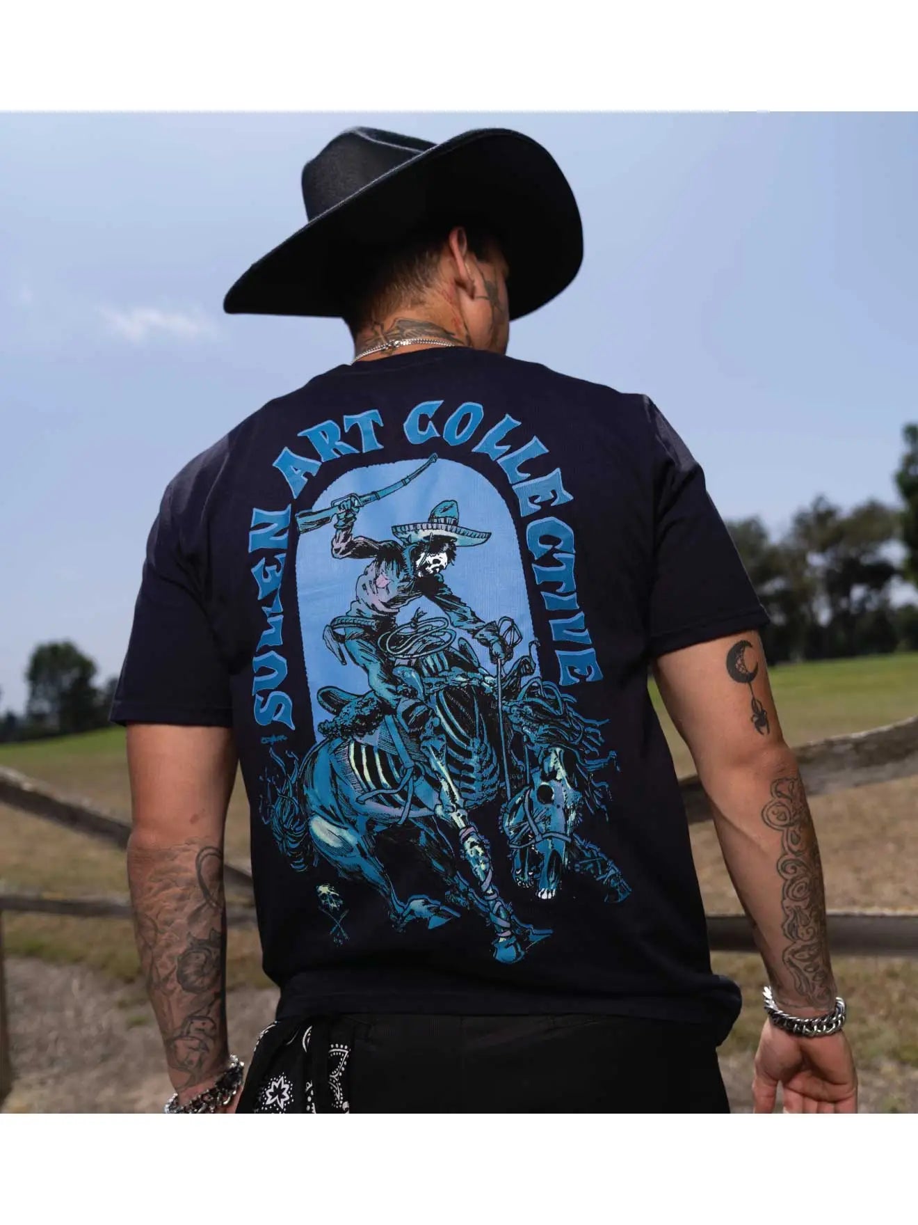Ghost rider cuts through the desert night—bones, dust, and electric blue haze. Fantasma by @defameart lands on our deep blue premium tee for a soft feel and an easy, everyday fit.
