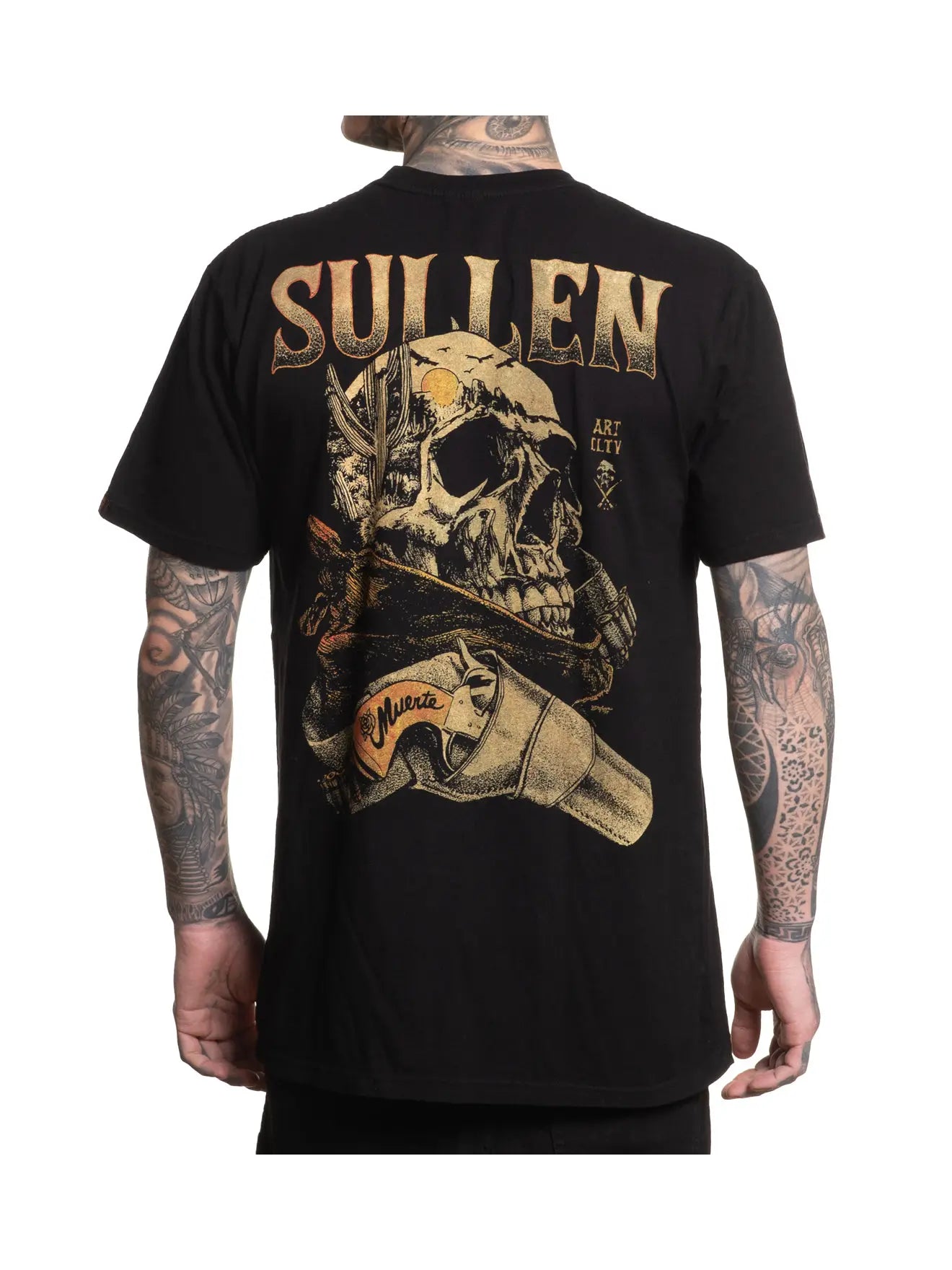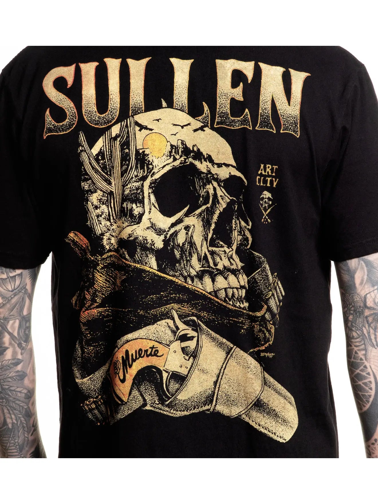 Muerte stacks a desert skull against a worn six-shooter—“Muerte” etched on the grip—washed in sand-gold inks that pop off jet black. Classic bandido energy from our Bandidos de Arte capsule, printed on our premium tee for a soft feel and a clean, everyday fit.