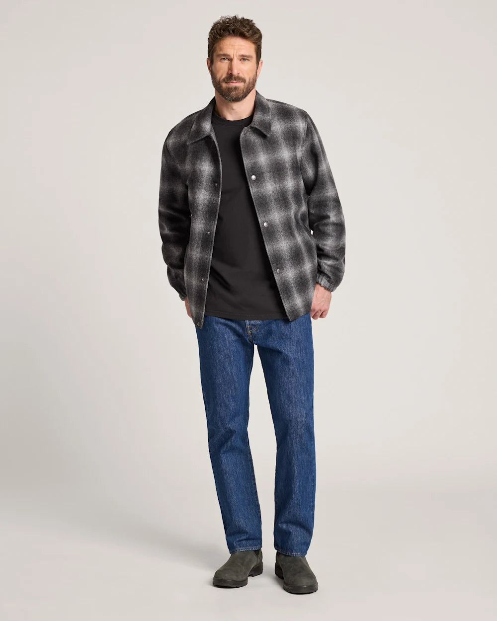Heritage meets warmth in this classic wool jacket with quilted insulation. Details include a spread collar, a snap front, roomy front welt pockets, and interior pocket. Straight hem and elastic at cuffs. Fully lined.