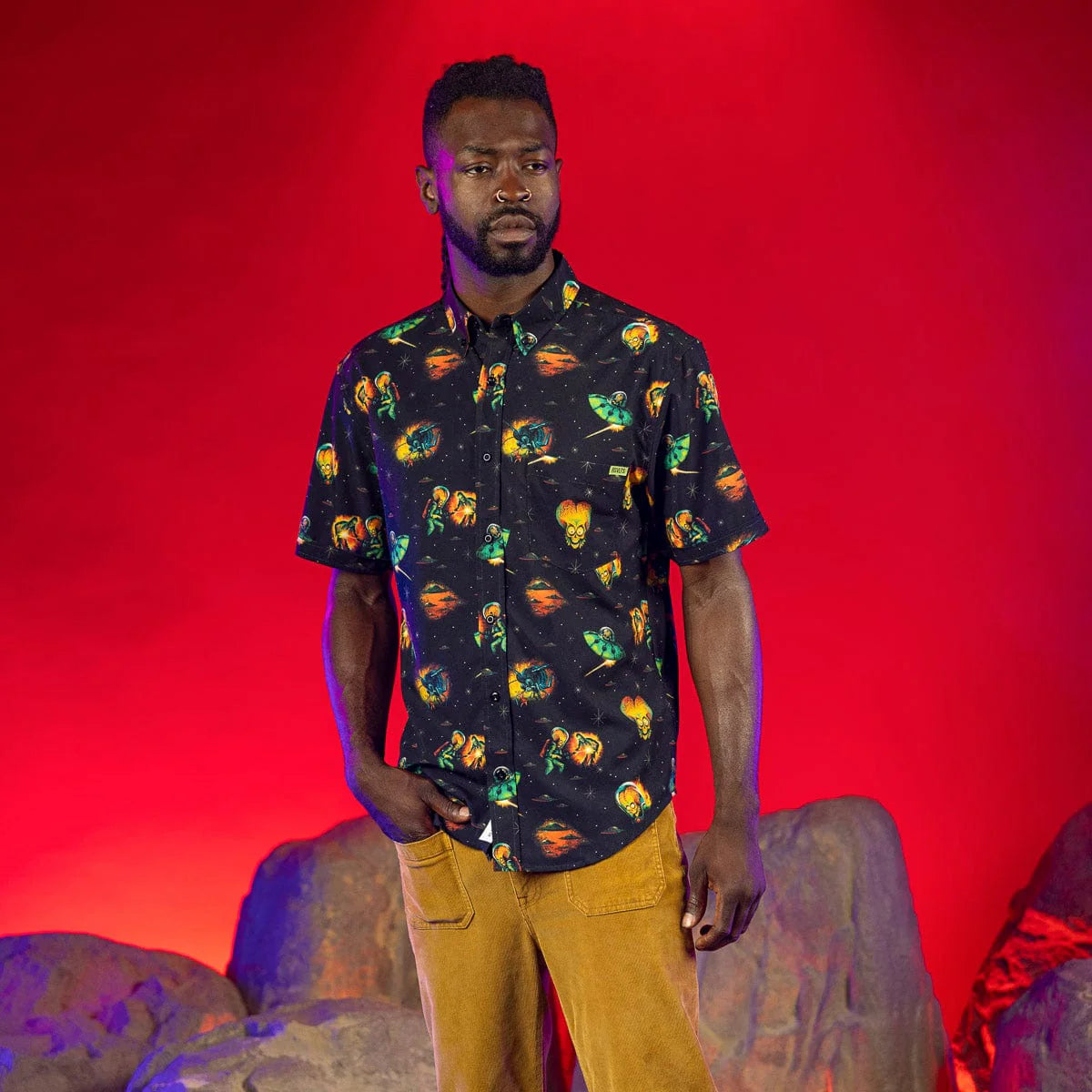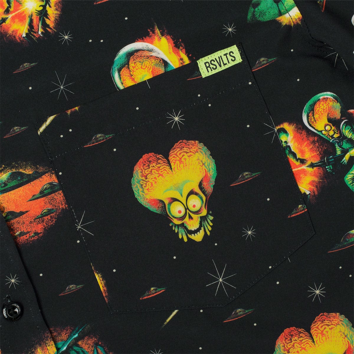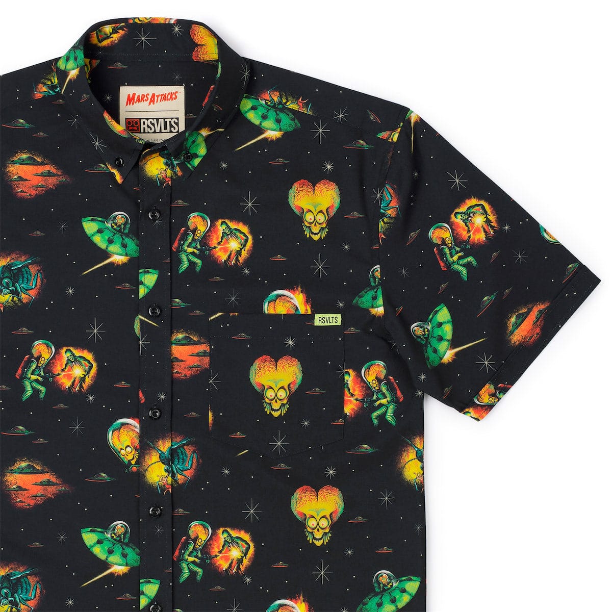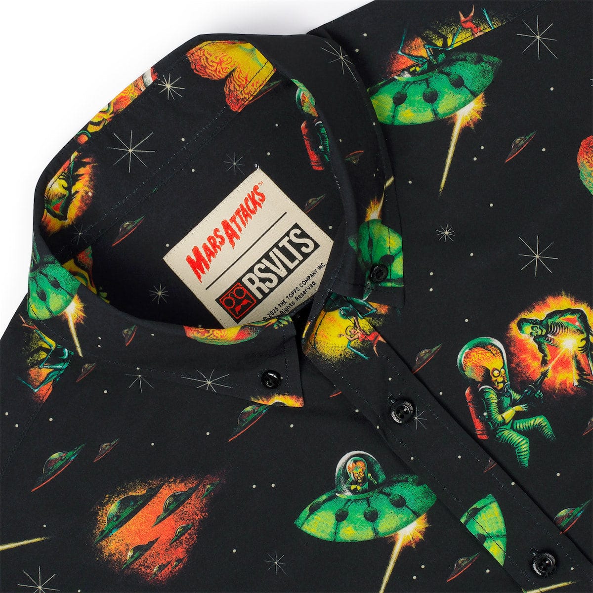 Brain-swollen invaders glare, Martian Death Rays turn Earthlings into sizzling skeletons, and behemoth bugs chomp helpless heroines. It’s danger! It’s chaos! It’s a Mars Attacks KUNUFLEX™ button down guaranteed to turn heads... and possibly remove a few.