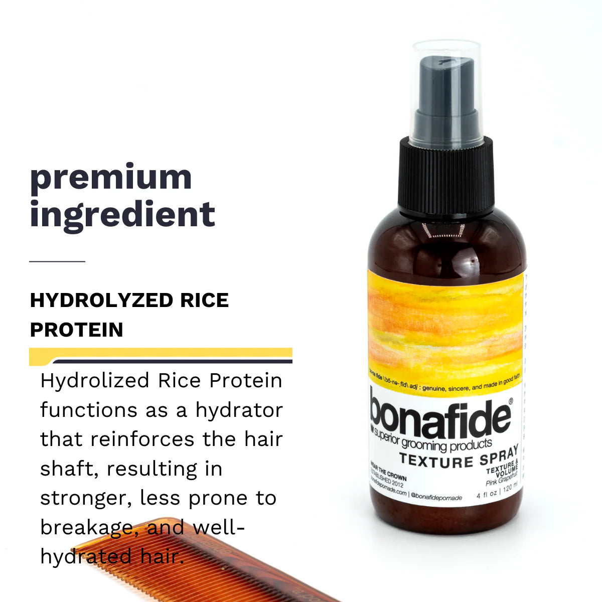 TEXTURE SPRAY is a light-weight formula that adds volume, root lift, body & shine to your hair! Enjoy as a stand alone product for a natural look or use as a preparation spray in combination with one of Bona Fide's awesome pomades!